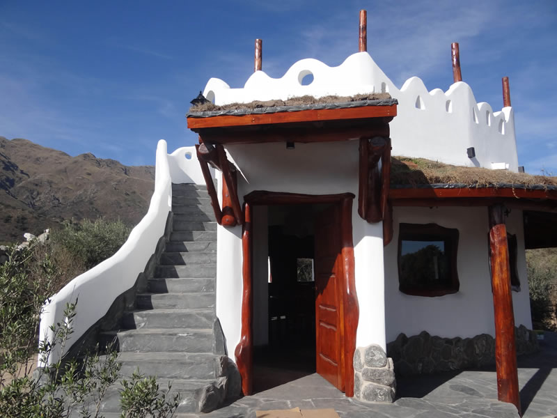 La Hostería Vegetariana está contruida con elementos naturales de la zona, respetando conceptos de rusticidad que facilitan a los moradores un entorno de paz y acercamiento a su ser interior. Las paredes interiores están contruidas con adobones realizados con tierra de la zona, los muros exteriores, de 40 cm. de espesor, confeccionados con piedras de arroyos cercanos, brindando un fuerte poder energético y siendo además altamente térmicos. Brindando de este modo, frescura en verano y calidez en invierno. Los pisos son de piedras lajas. Las aberturas son de maderas duras, realizados en carpintería rústica con herrajes de hierro. Los muebles están construidos con troncos y tablas rústicas, brindando una calidez sumamente acogedora. Los colchones son Suavestar Superstar con estructura de resortes Maxspring®: (continuos), de 28 cm de altura, los que posibilitan un descanzo premium.